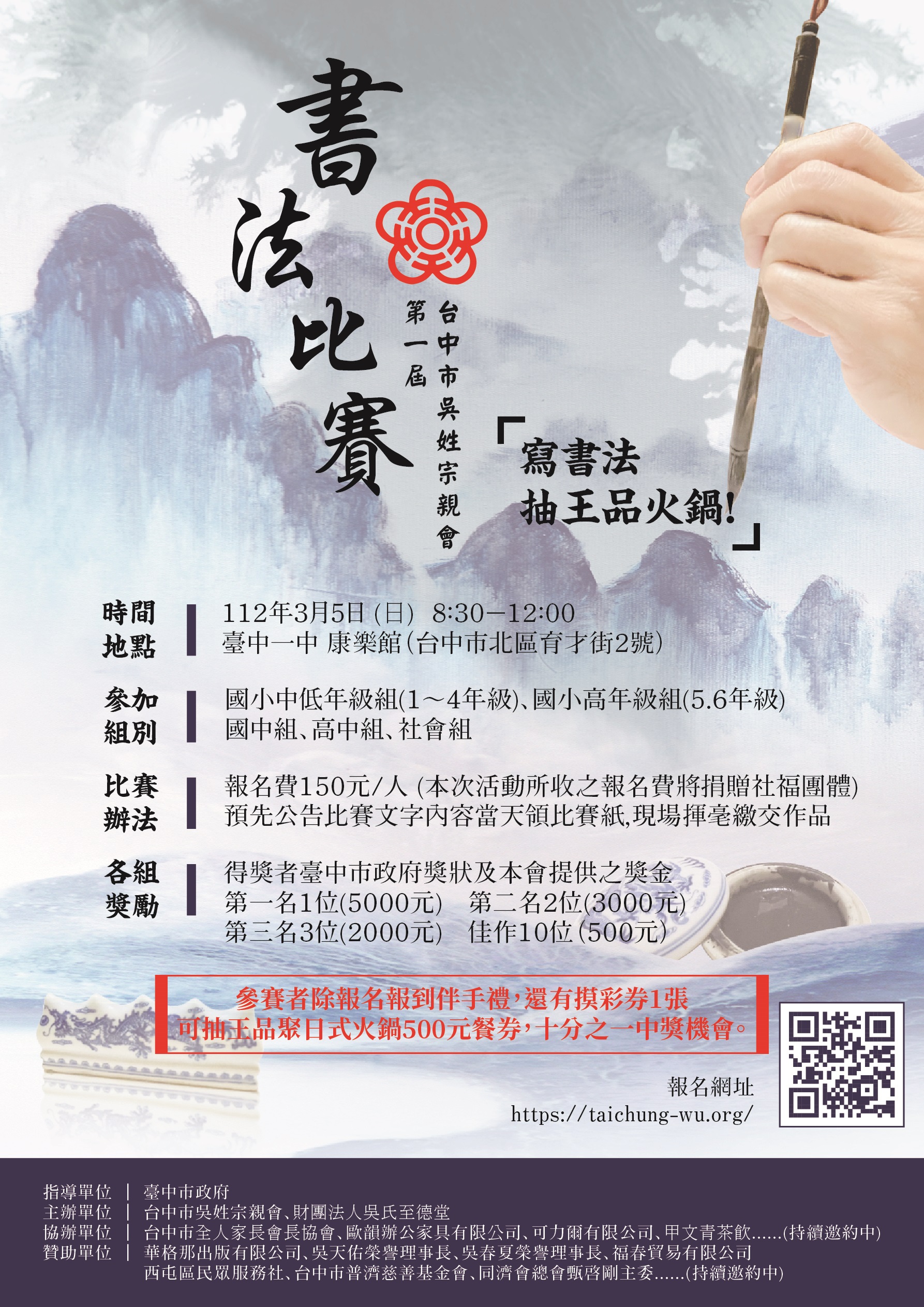 一、活動宗旨 中華文化博大精深,書法寫作更是中華文化延續重要代表,【台中市吳姓宗親會】為提升國人對書法的認識與興趣,帶動台中市各界青年學子提筆書寫,將廣邀各界人士共同參與本次活動希望透過互相觀模切磋,延續漢字藝術的傳統,培養人文精神。 二、指導單位 臺中市政府 三、主辦單位 台中市吳姓宗...